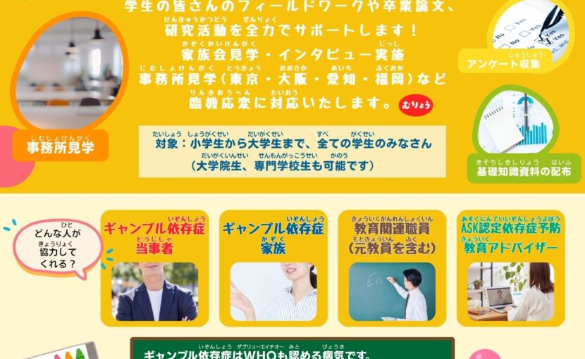 フィールドワークでギャンブル依存症を学ぼう!【依頼に応じて随時開催】 2025.10.16 講座・イベント情報 ギャンブル依存症の当事者・家族へのインタビューや家族会見学、事務所見学など、リアルな体験を通して学べる活動を行っています。 Googleフォームよりお気軽にお問い合わせください。 https://forms.gle/fm4L7g6DLENqmEqq6 Tweet 講座・イベント情報