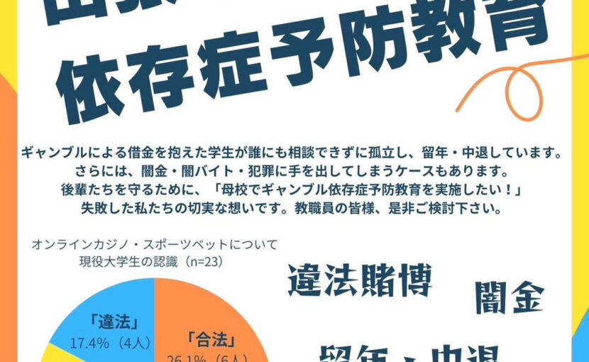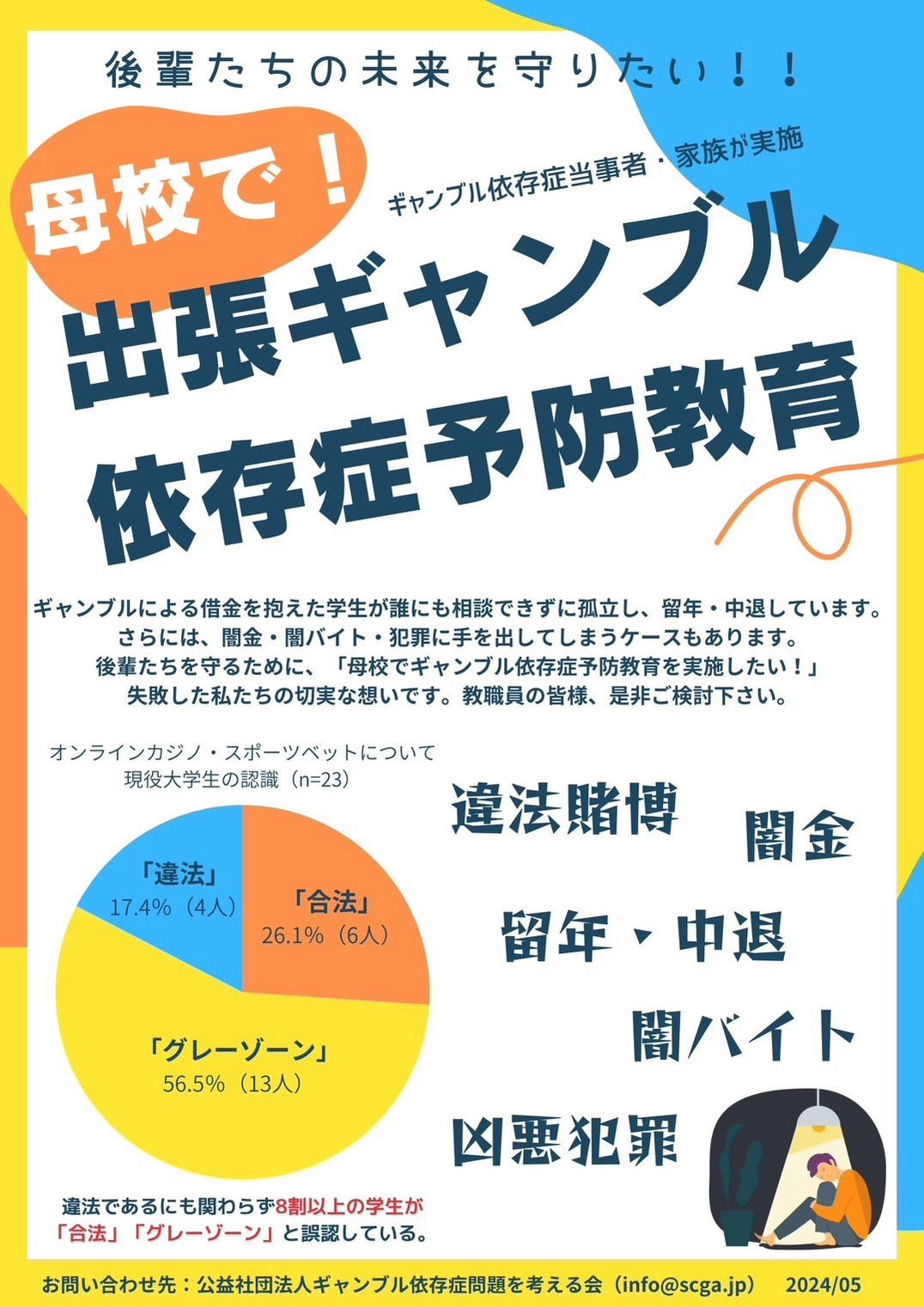 ギャンブル依存症予防教育 2025.10.9 講座・イベント情報 「ギャンブル依存症予防教育」を行っています! 借金や孤立で悩む学生が増えています。 後輩たちの未来を守るため、当事者や家族が母校などで予防教育を実施します。 (母校以外でもご相談ください) 問い合わせ先 info@scga.jp Tweet 講座・イベント情報