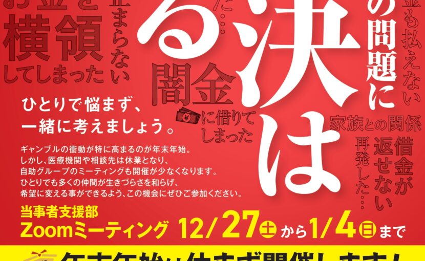 当事者Zoomミーティング 年末年始特別開催 2025.12.11 講座・イベント情報, 開催済み 【年末年始当事者Zoomミーティング.pdf】 年末年始期間【 2025年12月27日(土)〜2026年1月4日(日) 】は、休まずZoomミーティングを開催します 以下のリンク先よりZoomミーティングにお入りください。 ●9時・14時 開催 ミーティングID: 968 8279 5949 パスコード: 556119 【9時・14時用】 ●21時 開催 ミーティングID: 980 3797 3144 パスコード: 731778 【21時用】 当ミーティングは、ギャンブルに問題のある当事者のみご参加可能です。 当事者以外の方のご参加はご遠慮ください。 Tweet 講座・イベント情報, 開催済み 12ステップ, ギャンブル, ギャンブル依存症, セミナー, プログラム, 依存症, 借金, 回復, 家族会, 当事者, 治る, 相談