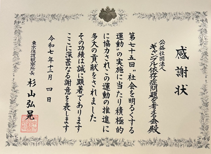 The Society Concerned about Gambling Addiction is honored to announce that we have been selected as a recipient of the Certificate of Appreciation for the “Movement to Brighter Society,” following a recommendation by Ota City.