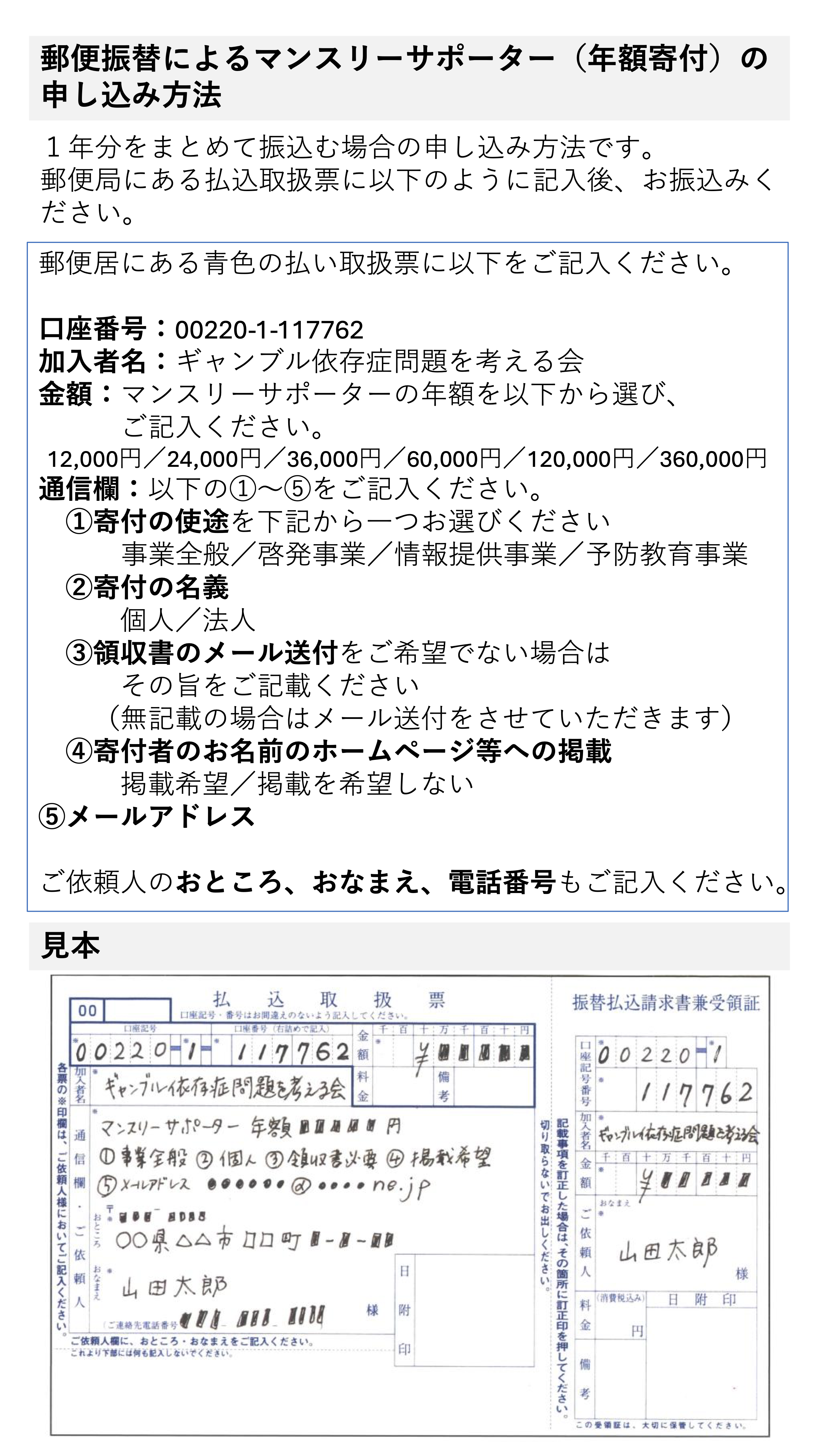 Account Name:公益社団法人ギャンブル依存症問題を考える会